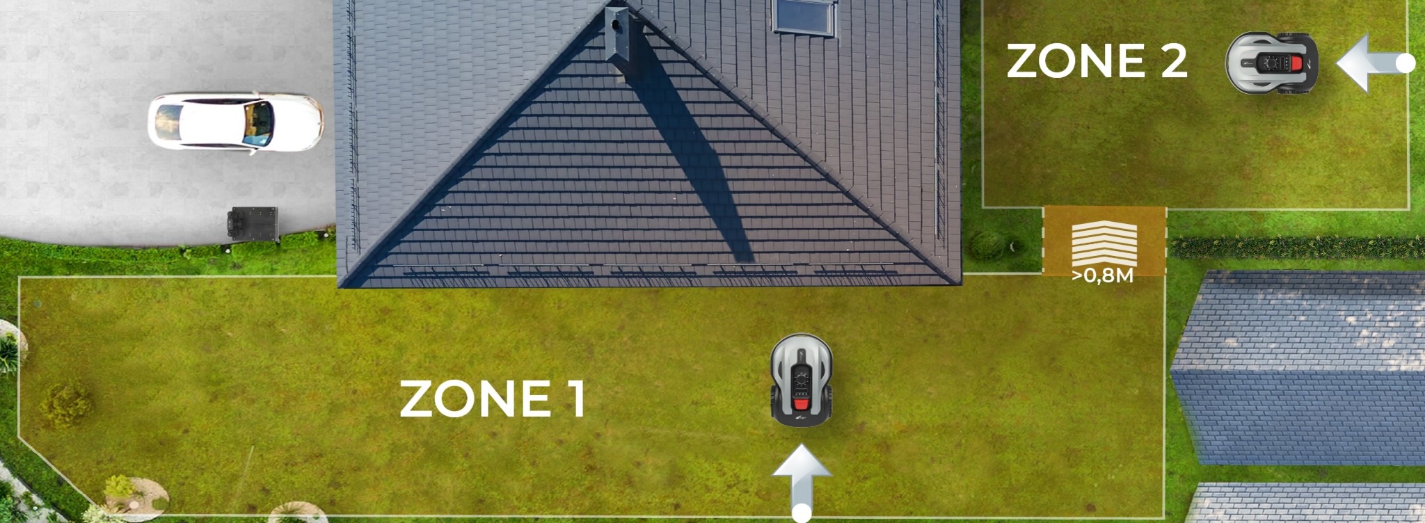 Het is mogelijk om met deze robotmaaier verschillende zones/velden te maaien. Dit is erg handig als je verschillende stukken grasvelden rondom je huis hebt. Zolang de ruimte er voor de maaier is om naar de stukken toe te kunnen rijden, kunnen al die velden gemaaid worden. Je kunt bijvoorbeeld in de App bepaalde functies aangeven, zoals waar de robotmaaier het veld in moet gaan. Zorg ervoor dat de doorrij breedte naar een ander gazon minimaal 0,8 meter breed is. Anders zal de robot moeite hebben om naar het andere gazon te komen. Met de zone indeling kun je aangeven waar op de grenskabel hij het veld in moet gaan. Hierbij kun je aangeven na hoeveel meter hij het veld in moet rijden en hoeveel procent van de totale ingestelde maaitijd de robot in dit gedeelte moet blijven maaien. De robot kan over een pad rijden mits deze op gelijke hoogte is als het gras en verhard is (geen grind e.d.)