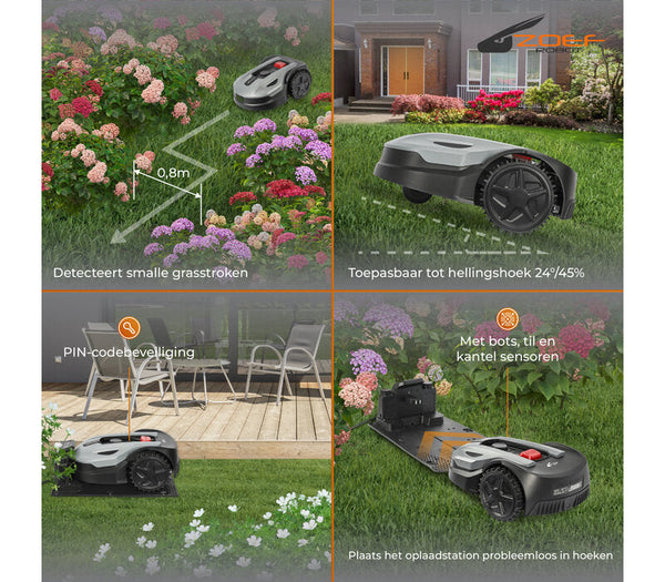 • Dankzij geavanceerde sensoren herkent de robotmaaier automatisch smalle stroken, zodat geen enkel stukje gras wordt overgeslagen. De minimale doorgang moet daarbij moet groter zijn dan 80cm.
