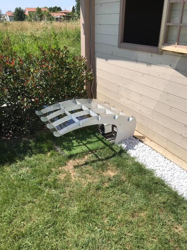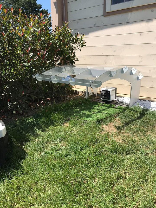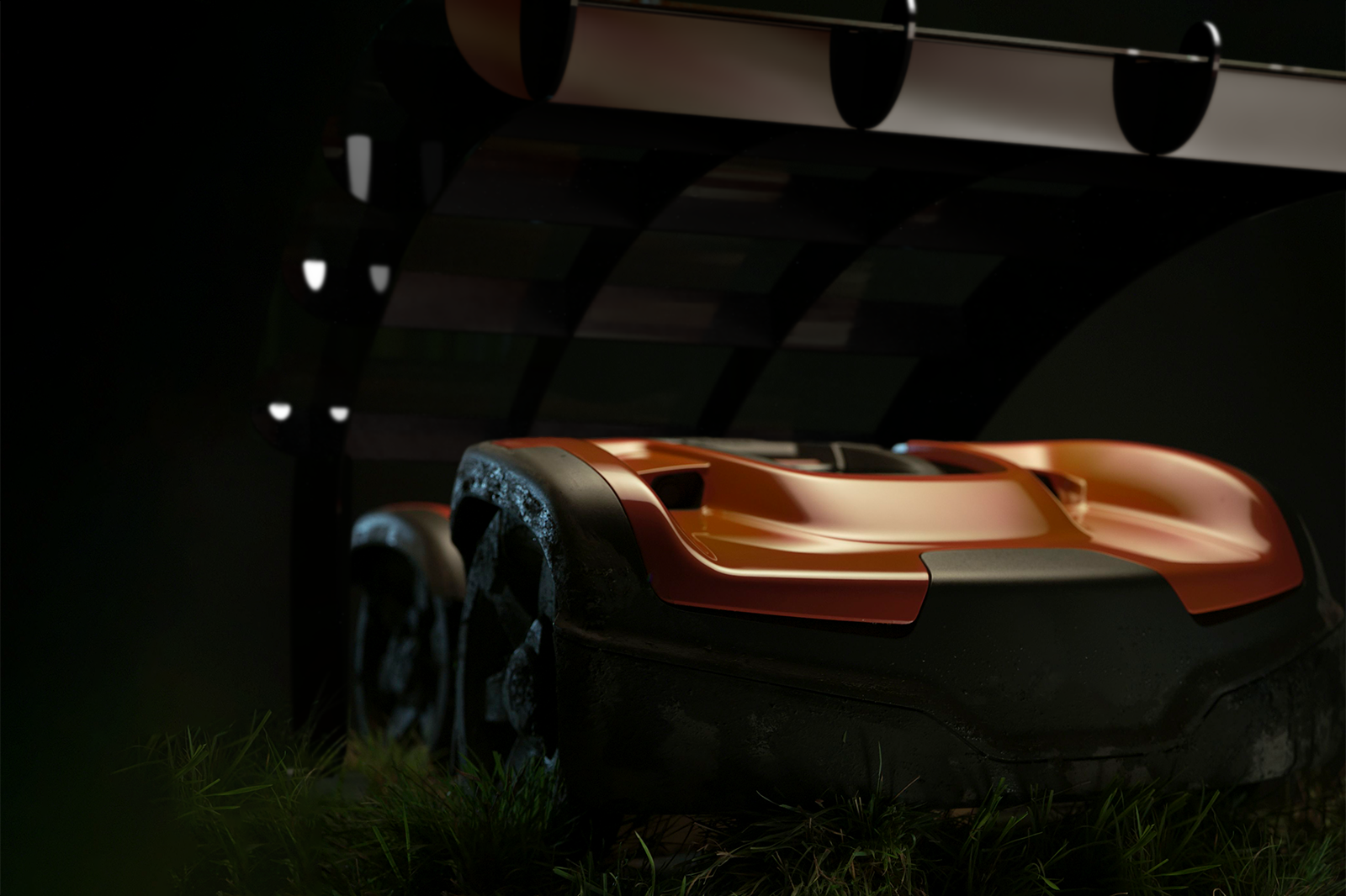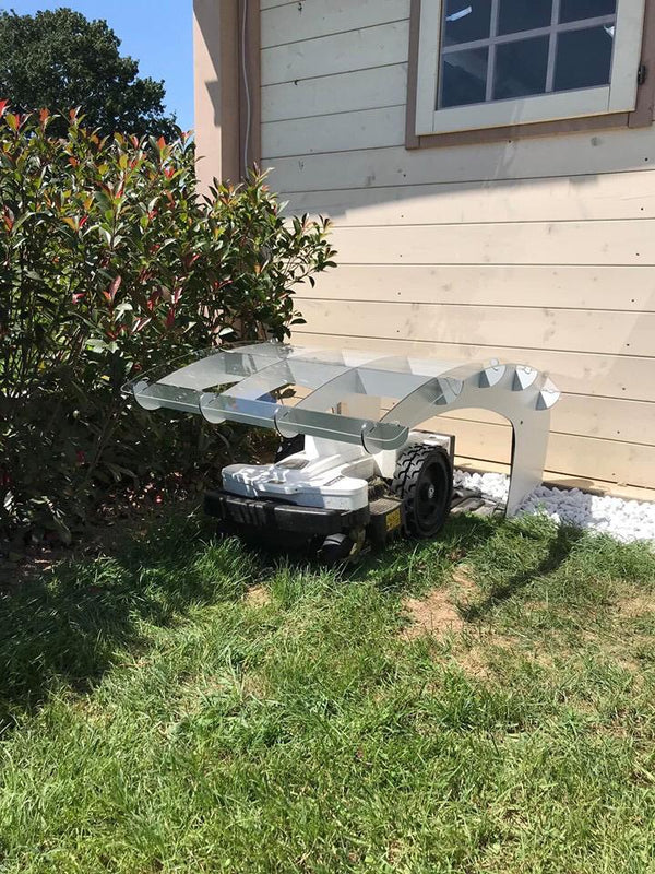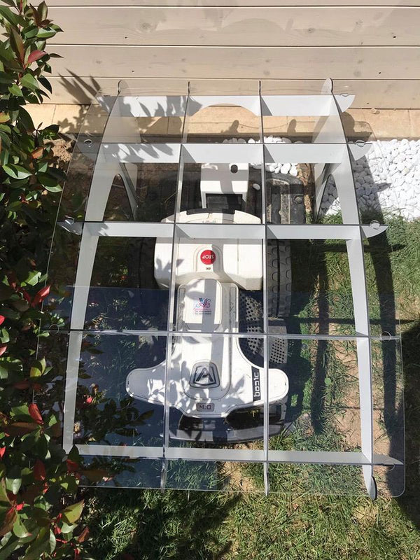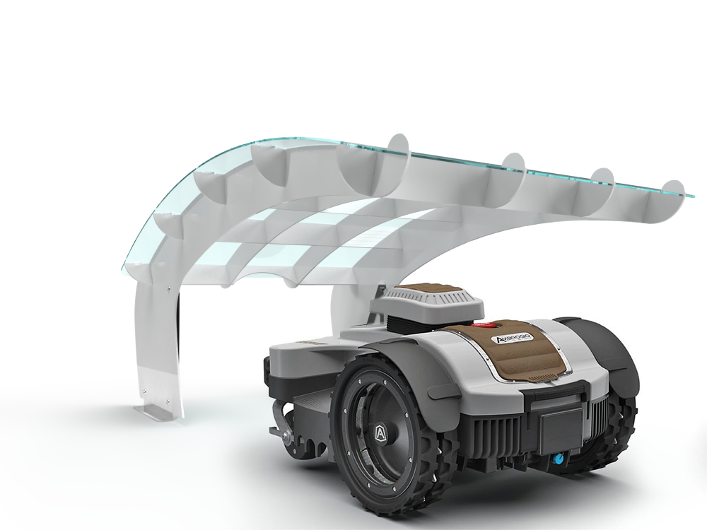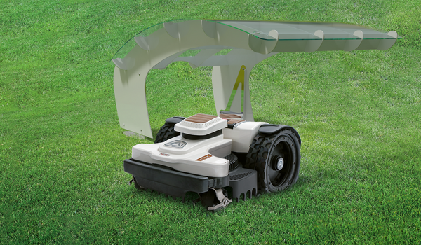 De meeste garages verbergen uw robotmaaier. De Wing van de Idea Mower benadrukt het, met een grote transparante hoes die wordt ondersteund door een lichtgewicht frame met kruisribbels zo sterk als een vliegtuigvleugel.